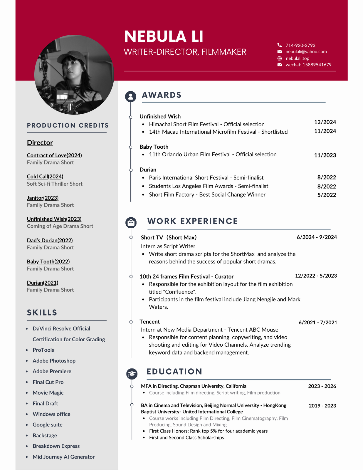 Based in the vibrant city of ShenZhen, Nebula Li is a director acclaimed for her masterful portrayal of family dynamics. With an innate ability to explore the complexities of modern familial relationships, she brings to light both the warmth and vulnerability inherent in human nature. Her films serve as mirrors reflecting contemporary family life, allowing audiences to see their own experiences in relatable yet profound narratives. Li excels at uncovering deep emotional resonance in everyday moments, weaving tales of familial bonds and generational conflicts into thought-provoking domestic dramas.
